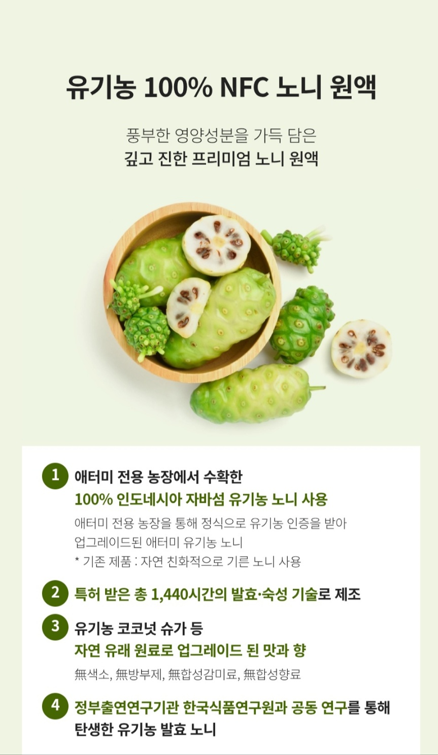 바로 그 해답이 **‘애터미 오롯이 담은 유기농 발효 노니’**입니다.